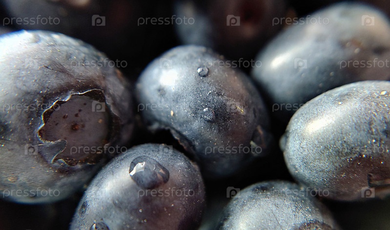 Крупные спелые ягоды черники с каплей воды крупным планом.Макросъемка.Текстура или фон.Избирательный фокус