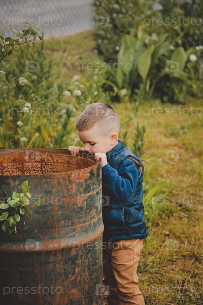 Мальчик стоит рядом с ржавой металлической пустой бочкой и заглядывает внутрь