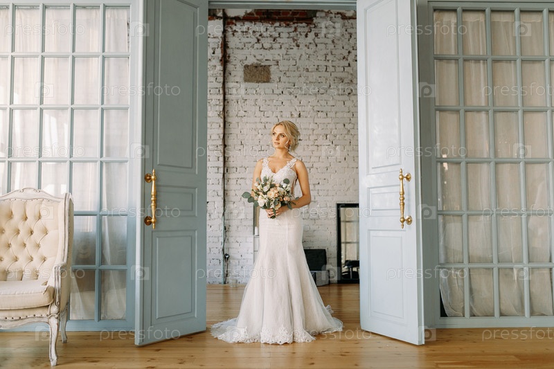 Белокурая невеста в свадебном платье и с букетом цветов стоит у открытой двери в студии