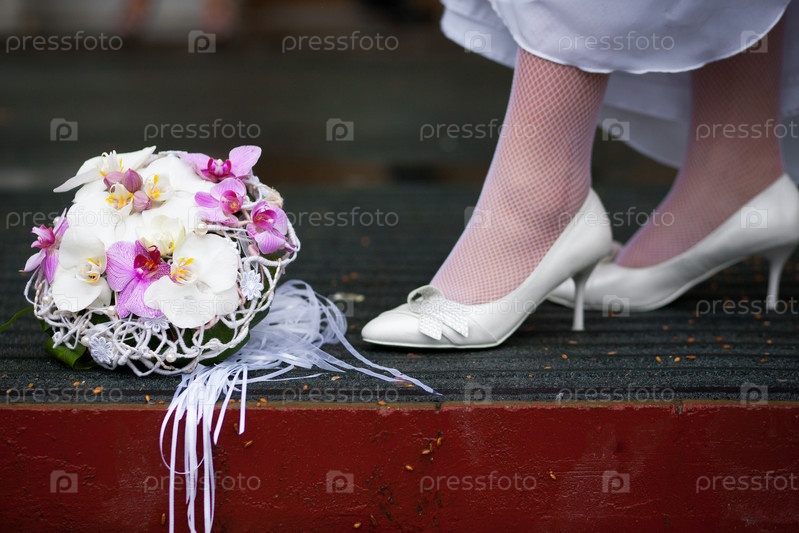 Невеста в белых свадебных туфлях стоит рядом с красивым свадебным букетом. Вид снизу. Крупный план