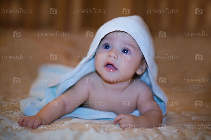 Маленький улыбающийся младенец, завернутый в синее полотенце, лежит на кровати, вид снизу крупным планом
