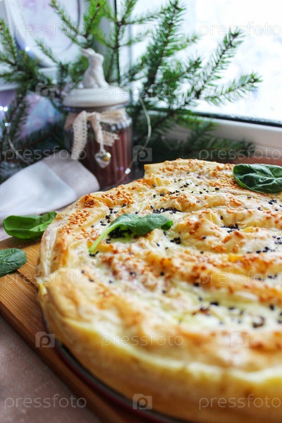 Большой круглый кусок запеченной лазаньи на деревянной разделочной доске крупным планом