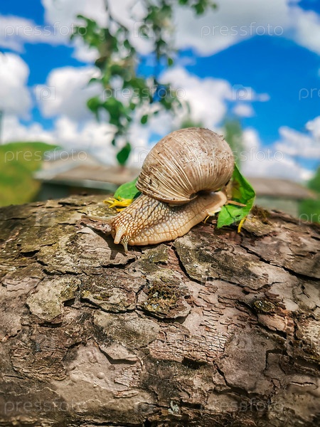 На открытом воздухе большая виноградная улитка ползает по поверхности старой яблони