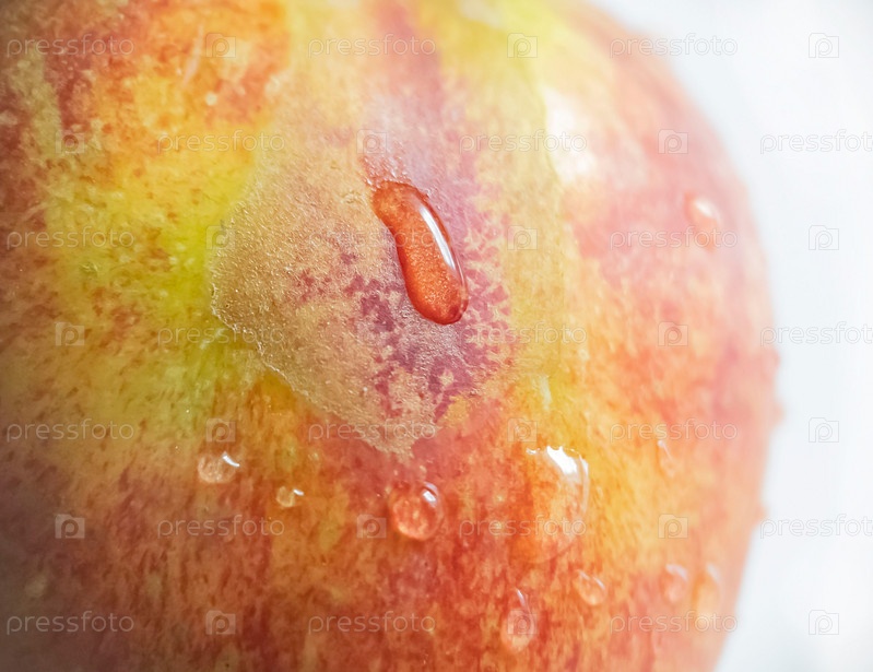 Красно-желтое яблоко с капельками воды на поверхности. Текстура или фон. Макро