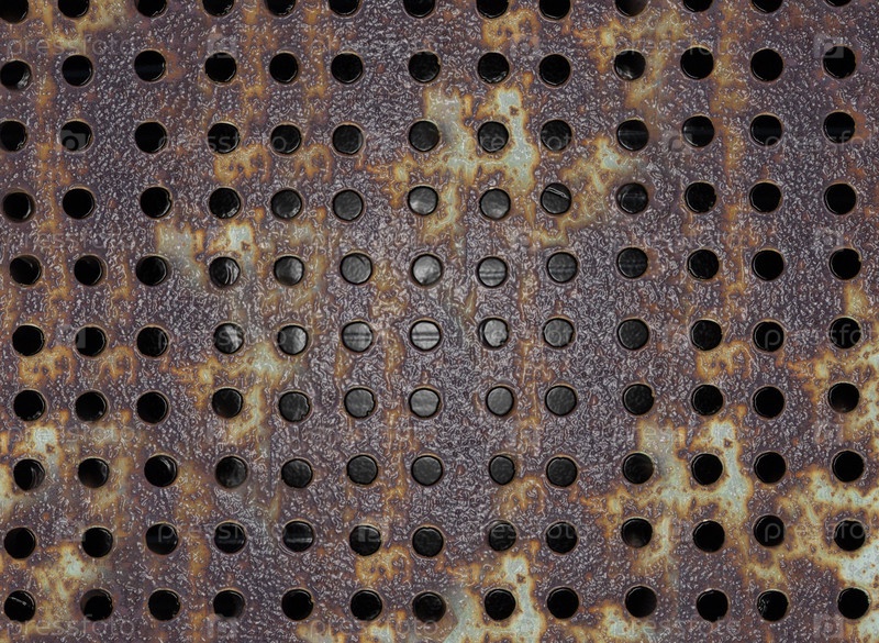 Фоновая текстура ржавой металлической пластины с круглыми отверстиями на поверхности крупным планом