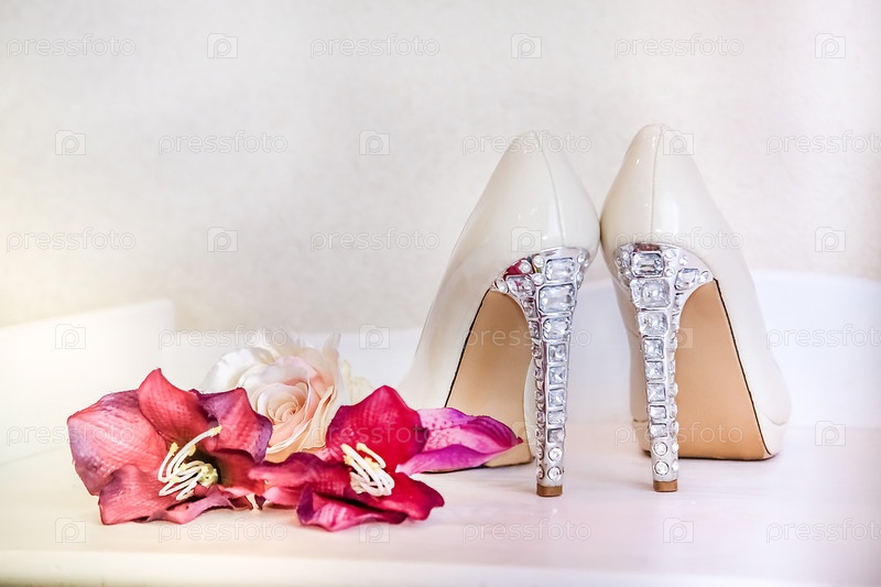 Белые туфли на высоком каблуке, украшенные стразами, рядом с розово-красной цветочной композицией