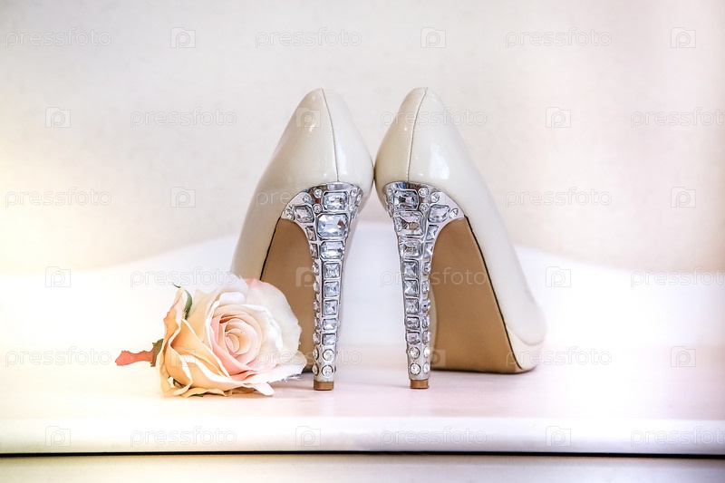 Элегантные белые туфли на высоком каблуке со стразами в сочетании с нежной розой создают свадебную атмосферу