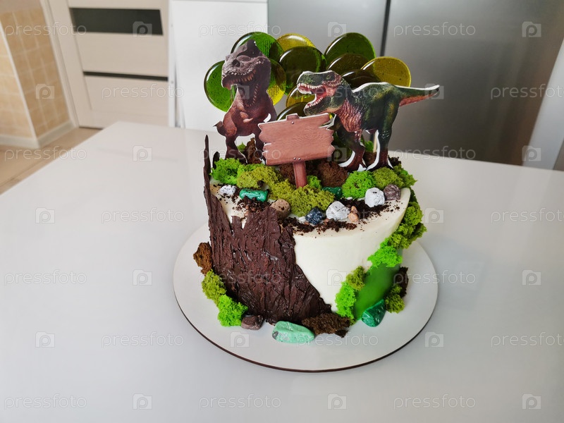 Сладкий десертный торт с двумя стилизованными динозаврами