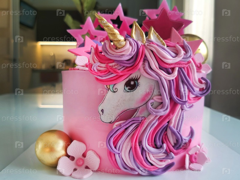 Концепция праздничного десерта для детей на день рождения в виде фантастического единорога. Текстура или фон