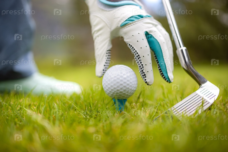 Рука в перчатке кладет мяч для гольфа на ти