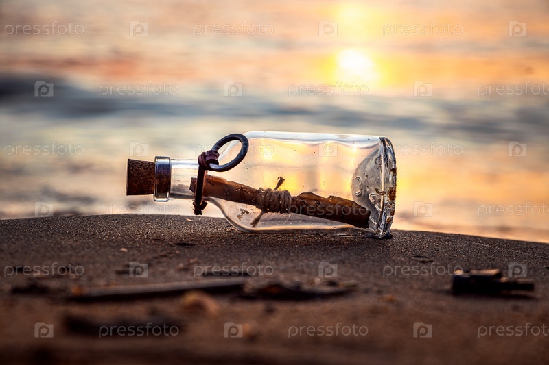 Послание в бутылке на фоне заката Солнца