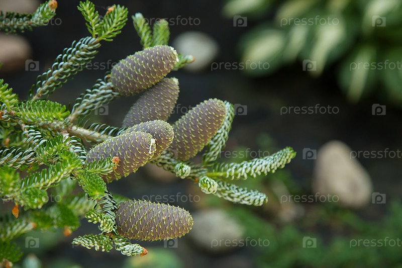 Корейская зеленая ель с шишками на ветке, вид сбоку крупным планом