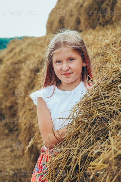 Девочка в розовом платье позирует возле тюков соломы летним днем