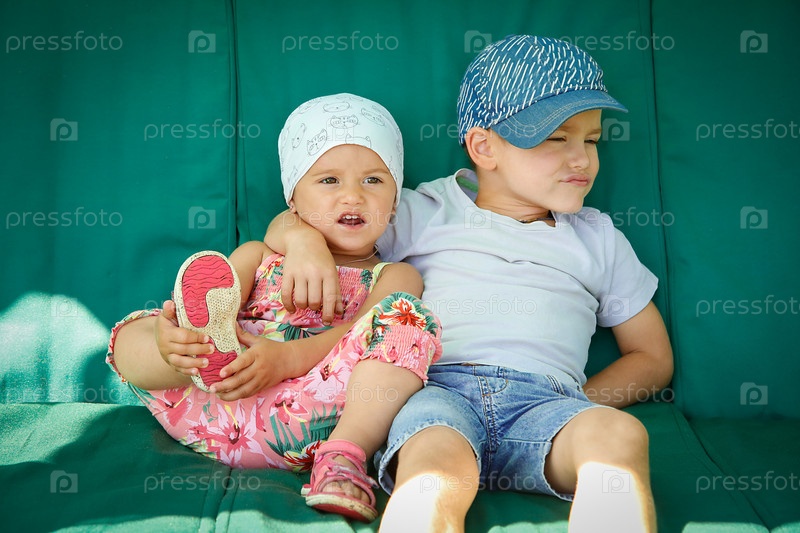 Мальчик и девочка весело проводят время, играя летом на зеленых садовых качелях