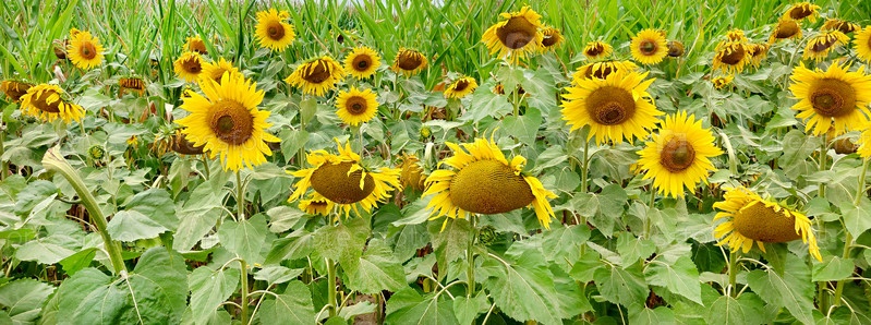 Поле желтых подсолнухов, опустивших свои головки в пасмурный день. Текстура или фон