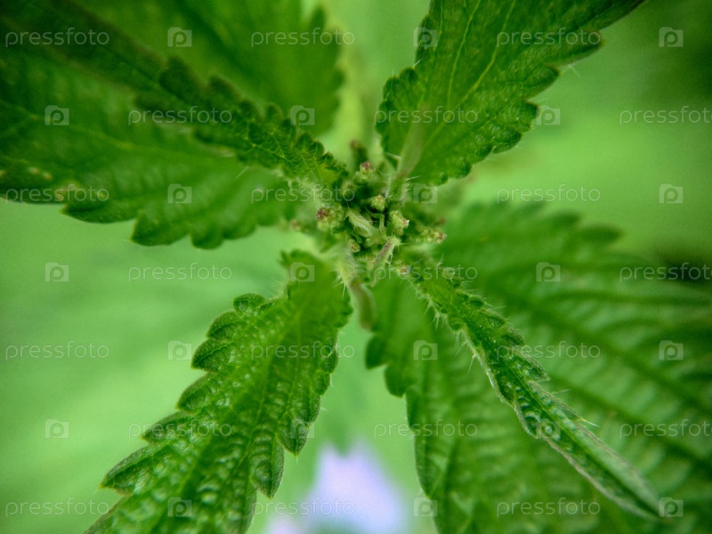 Фоновая текстура верхушки молодой крапивы крупным планом.Макрофотография.Текстура или фон.Выборочный фокус