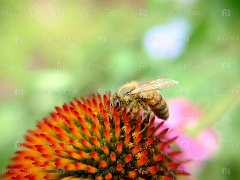 Один цветок эхинацеи с пчелой крупным планом на открытом воздухе.Макрофотография.Текстура или фон.Избирательный фокус