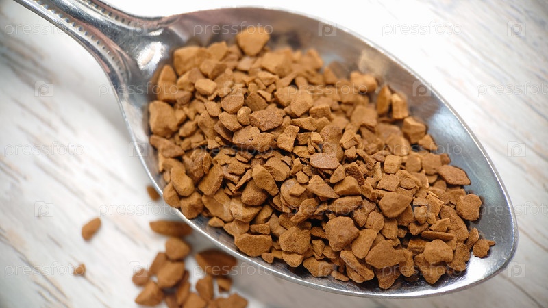 Макросъемка. Растворимый кофе в ложке на деревянном фоне. Текстура или фон