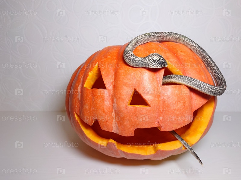 Вырезанное из тыквы лицо со змеей на Хэллоуин