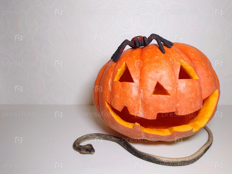 Хэллоуин, улыбающееся вырезанное лицо из оранжевой тыквы со змеей и черным пауком на белом фоне крупным планом