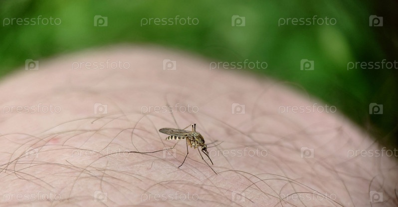Полосатый комар сидит на ноге мужчины на фоне травы на открытом воздухе.Макрофотография.Выборочный фокус