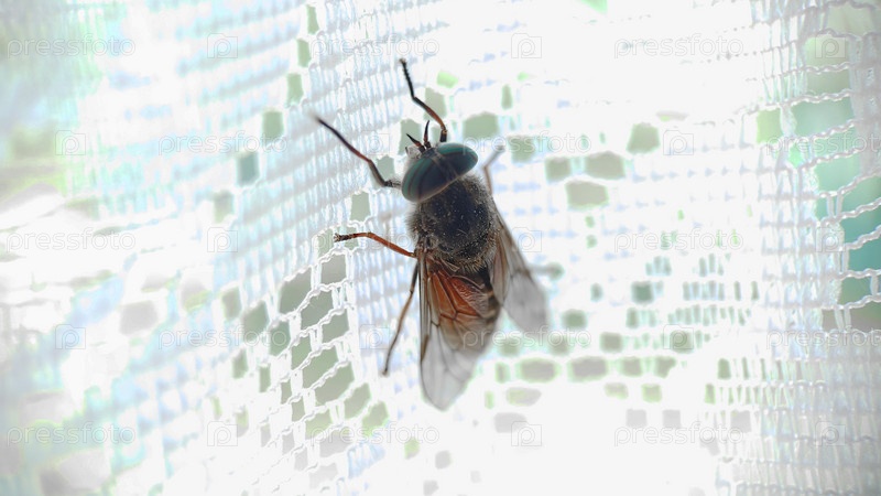 Макрофотография. Зеленоглазое насекомое овод крупным планом на кружевных белых занавесках. Текстура или фон. Выборочный фокус