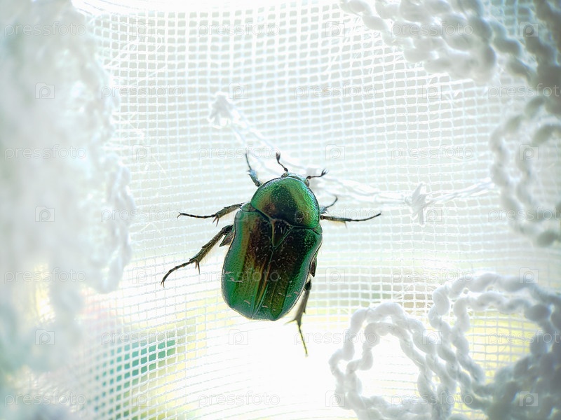 Макрофотография. Золотая бронза, Бронзовый жук крупным планом ползает по белым кружевным занавескам. Текстура или фон