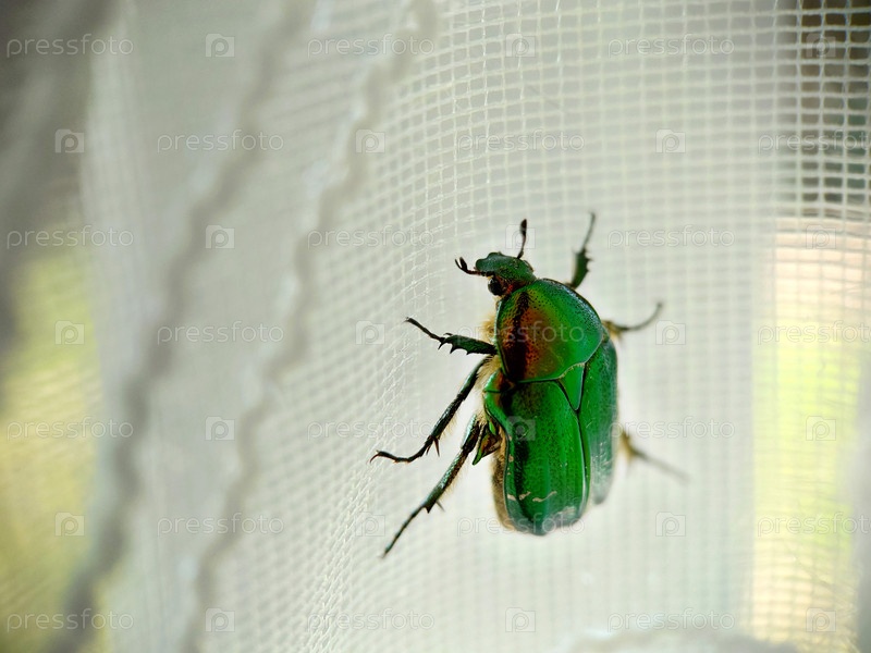 Большой зеленый жук ползет по кружевным белым занавескам крупным планом
