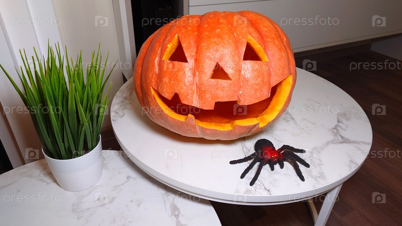 Хэллоуин, улыбающаяся оранжевая тыква с пауком и зеленой травой на белом столе крупным планом