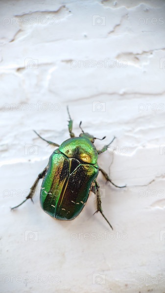 Макрофотография. Бронзовый жук ползает по белому старому подоконнику. Текстура или фон. Выборочный фокус
