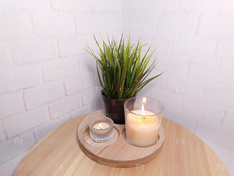 На светлом фоне две горящие свечи и горшок с травой