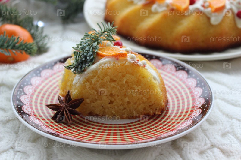 Кусок рождественского торта, украшенный долькой мандарина и хвойной веточкой крупным планом