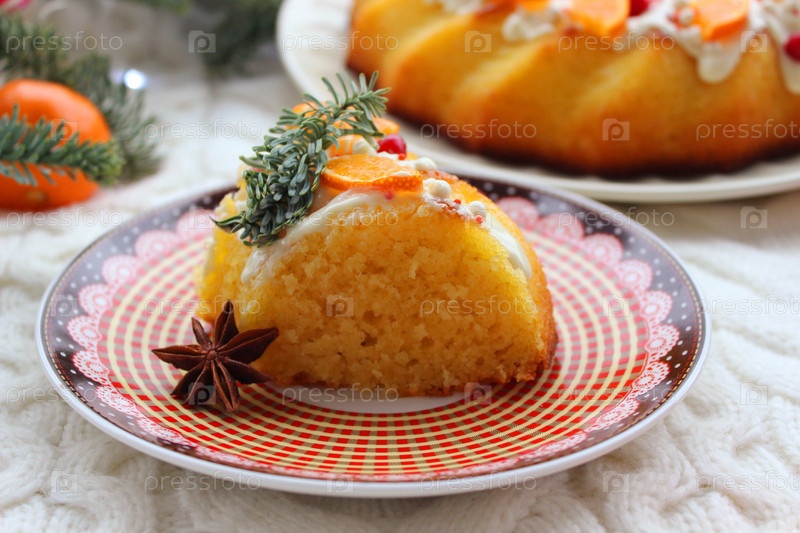 Кусок рождественского торта на столе, украшенный дольками мандарина и еловой веткой