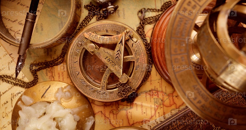 Путешествия и приключения в винтажном стиле. Винтажный старый компас и другие винтажные предметы на столе