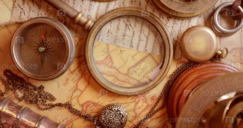 Путешествия и приключения в винтажном стиле. Винтажный старый компас и другие винтажные предметы на столе