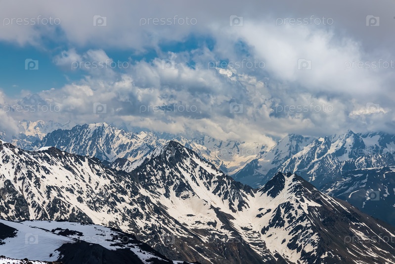 Горные облака над красивыми заснеженными вершинами гор и ледников. Вид на заснеженные горы