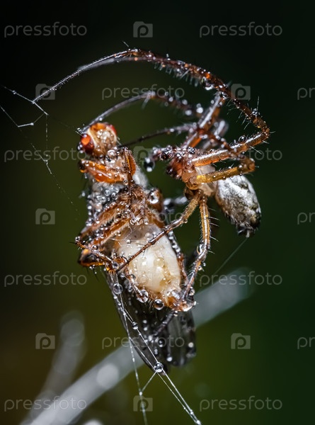 Макрофотография крупным планом показывает, как паук схватил жертву и обернул ее паутиной
