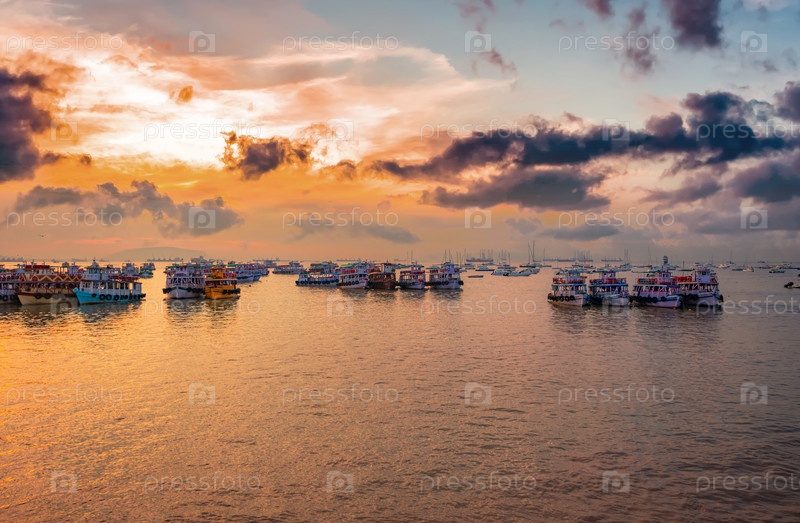 Лодки на воде Мумбаи на рассвете. Район Колаба в Мумбаи, Махараштра, Индия