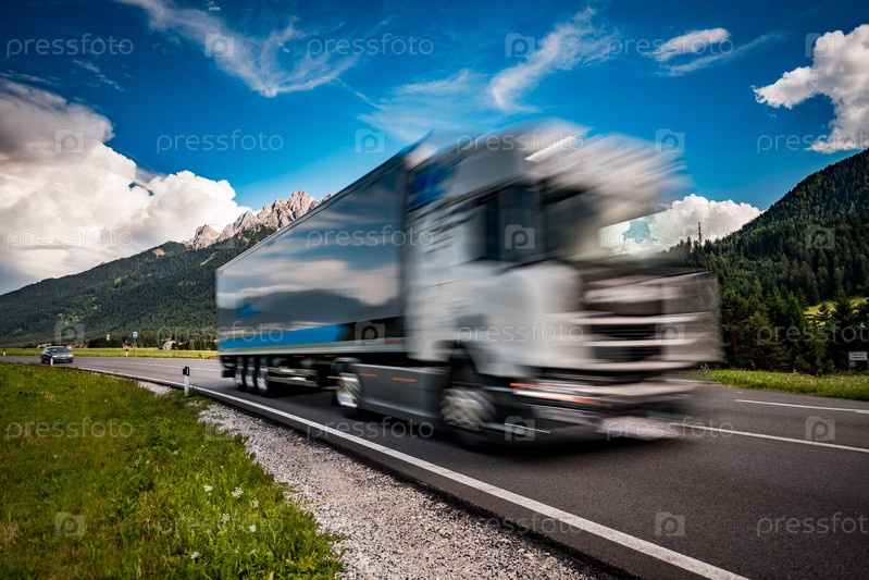 Бензовоз мчится по шоссе на фоне Альп. Грузовик Автомобиль в движении размыт