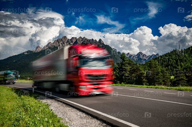 Бензовоз мчится по шоссе на фоне Альп. Грузовик Автомобиль в движении размыт