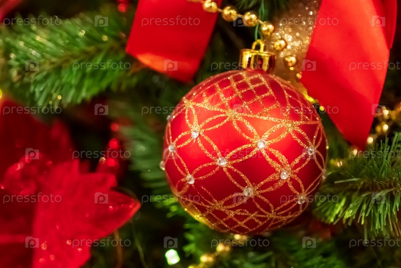 Красный елочный шар висит на елке