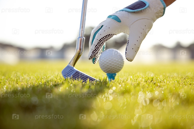 Рука в перчатке кладет мяч для гольфа на ти