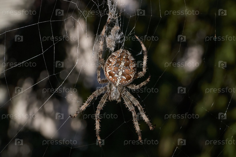 Аранеус сидит в центре паутины и ждет добычи, попавшей в сеть