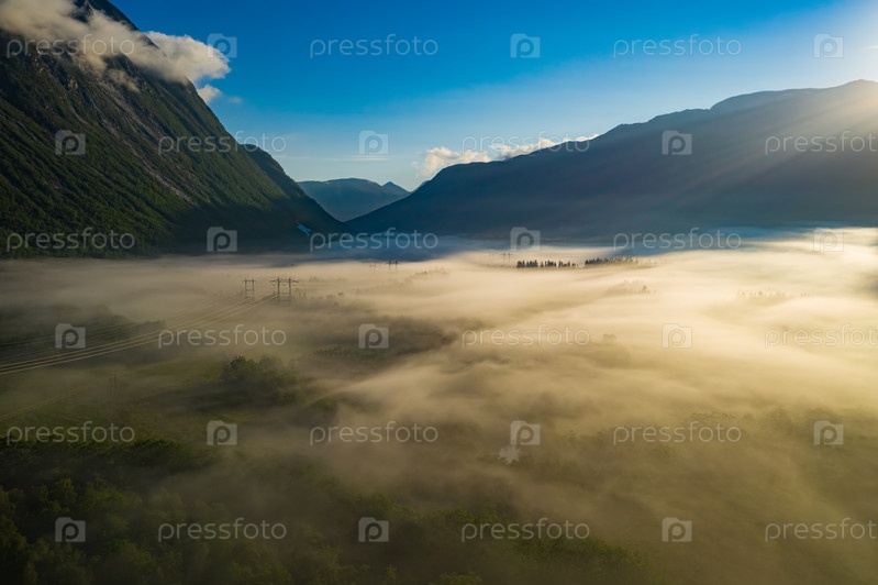 Утренний туман над долиной среди гор в солнечном свете. Туман и красивая природа Норвегии, кадры с воздуха