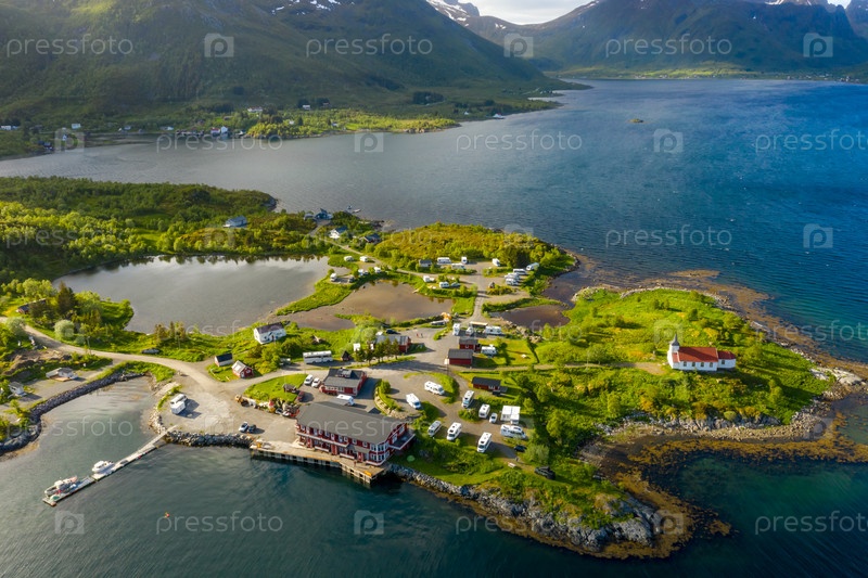 Прекрасная природа Норвегии Вид с воздуха на кемпинг для отдыха