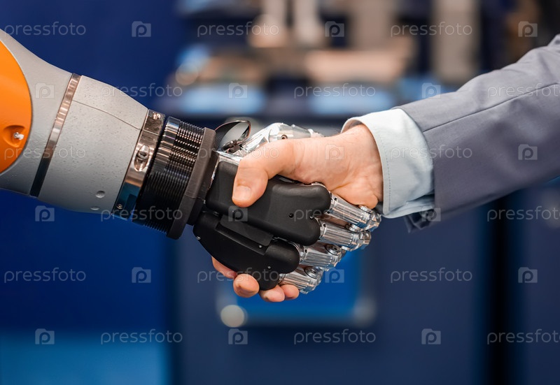 Рука бизнесмена пожимает руку роботу-андроиду