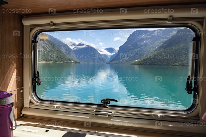 Вид из окна автодома RV Caravan на прекрасную природу Норвегии