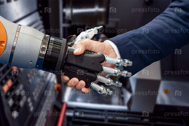 Рука бизнесмена пожимает руку роботу-андроиду