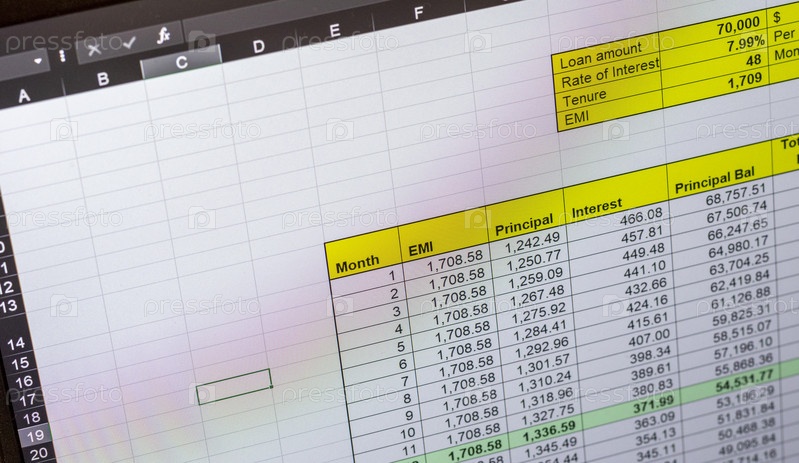 Снимок таблицы в темном режиме на экране компьютера, на которой показана таблица погашения банковского кредита. Банковское дело