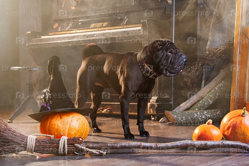 Огромный черный шарпей сидит рядом с метлой и тыквами. Атмосфера таинственности во время таинственного Хэллоуина